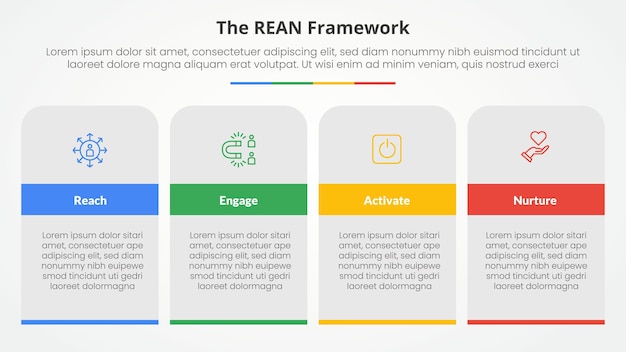 REAN framework infographic concept for slide presentation with table rectangle and round top with 4 point list with flat style